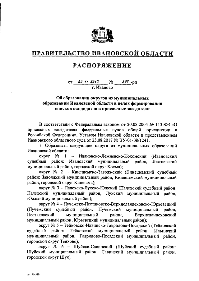 Распоряжение Правительства Ивановской области от 20.11.2017 N 208-рп "Об образовании округов из муниципальных образований Ивановской области в целях формирования списков кандидатов в присяжные заседатели"