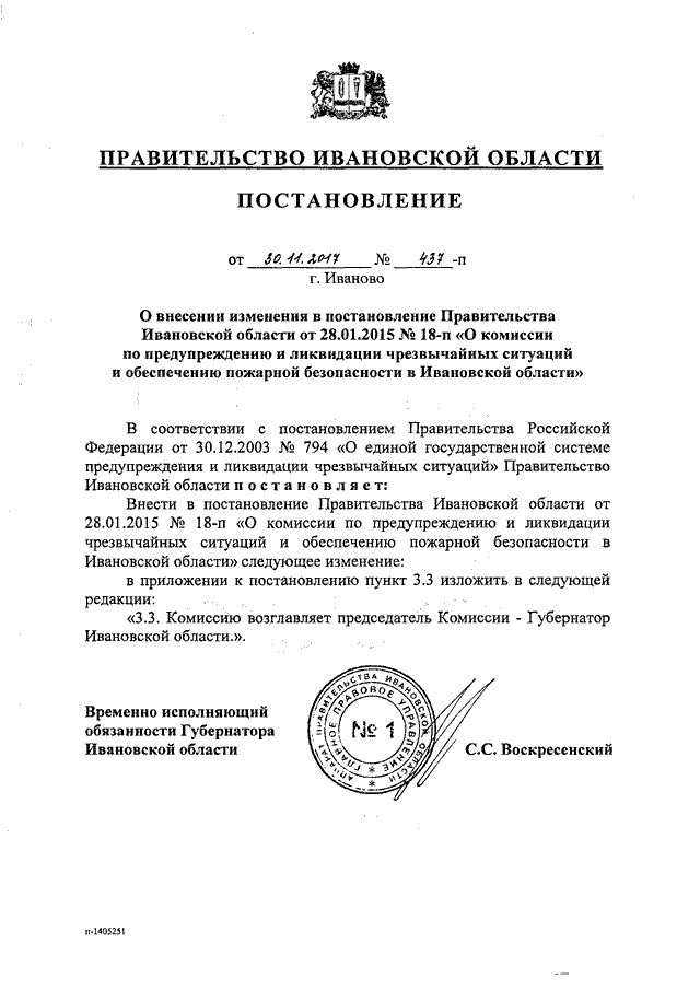 Постановление Правительства Ивановской области от 30.11.2017 N 437-п "О внесении изменения в постановление Правительства Ивановской области от 28.01.2015 N 18-п "О комиссии по предупреждению и ликвидации чрезвычайных ситуаций и обеспечению пожарной безопасности в Ивановской области"