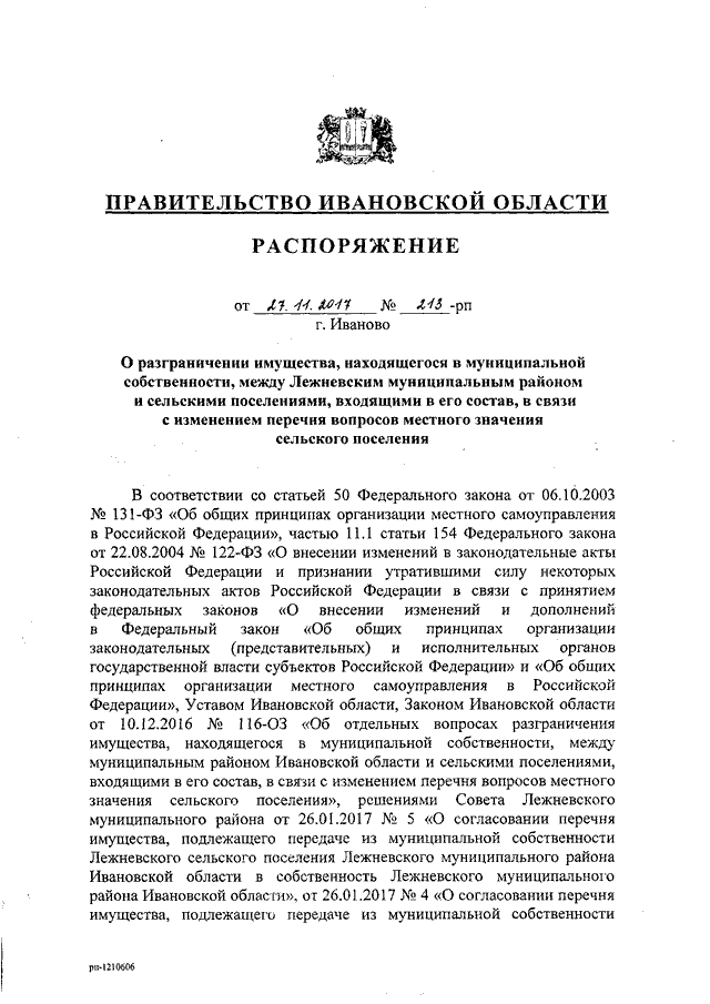 Распоряжение Правительства Ивановской области от 27.11.2017 N 213-рп "О разграничении имущества, находящегося в муниципальной собственности, между Лежневским муниципальным районом и сельскими поселениями, входящими в его состав, в связи с изменением перечня вопросов местного значения сельского поселения"