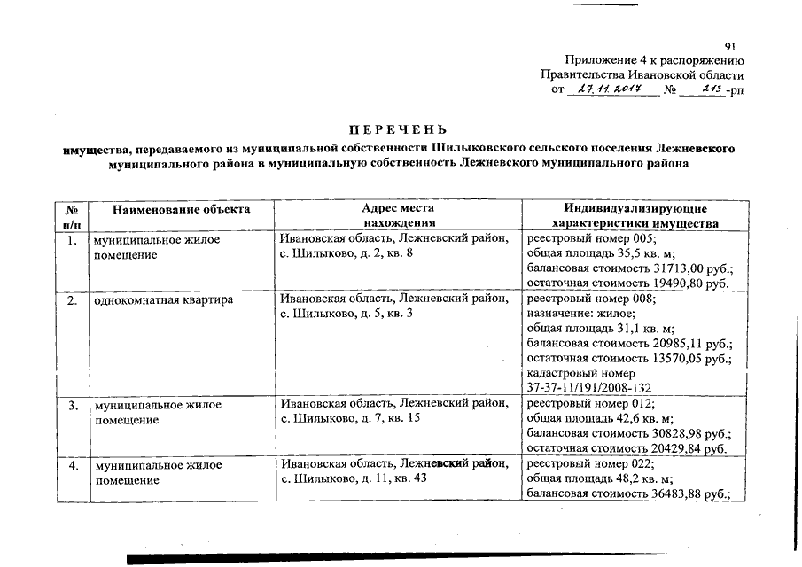 Распоряжение Правительства Ивановской области от 27.11.2017 N 213-рп "О разграничении имущества, находящегося в муниципальной собственности, между Лежневским муниципальным районом и сельскими поселениями, входящими в его состав, в связи с изменением перечня вопросов местного значения сельского поселения"