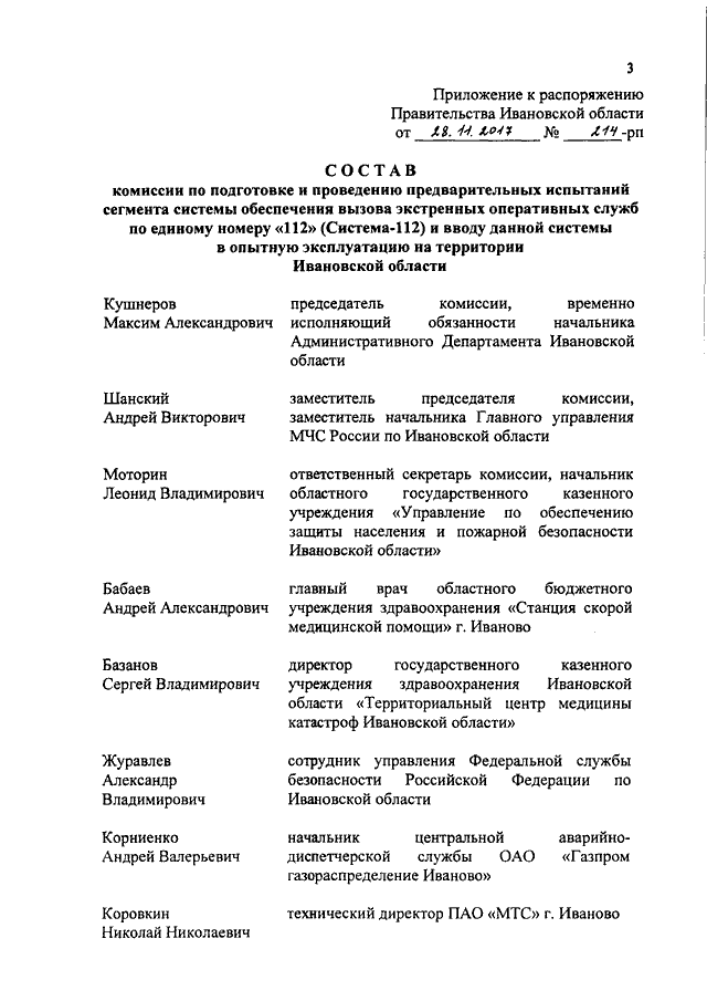 Распоряжение Правительства Ивановской области от 28.11.2017 N 214-рп "О создании комиссии по подготовке и проведению предварительных испытаний сегмента системы обеспечения вызова экстренных оперативных служб по единому номеру "112" (Система-112) и вводу данной системы в опытную эксплуатацию на территории Ивановской области"