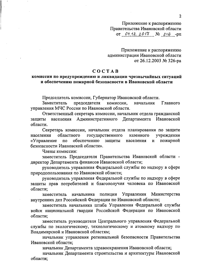 Распоряжение Правительства Ивановской области от 04.12.2017 N 216-рп "О внесении изменения в распоряжение администрации Ивановской области от 26.12.2003 N 326-ра "Об утверждении состава комиссии по предупреждению и ликвидации чрезвычайных ситуаций и обеспечению пожарной безопасности в Ивановской области"