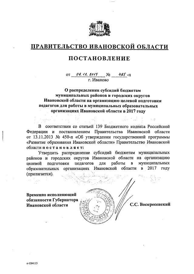 Постановление Правительства Ивановской области от 06.12.2017 N 465-п "О распределении субсидий бюджетам муниципальных районов и городских округов Ивановской области на организацию целевой подготовки педагогов для работы в муниципальных образовательных организациях Ивановской области в 2017 году"