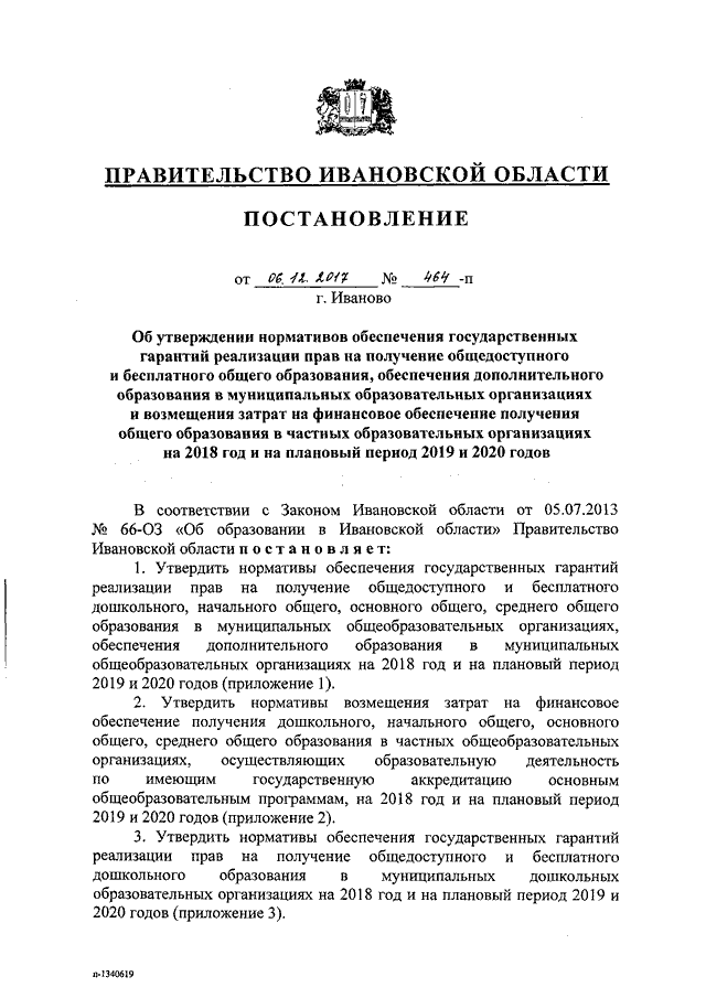 Постановление Правительства Ивановской области от 06.12.2017 N 464-п "Об утверждении нормативов обеспечения государственных гарантий реализации прав на получение общедоступного и бесплатного общего образования, обеспечения дополнительного образования в муниципальных образовательных организациях и возмещения затрат на финансовое обеспечение получения общего образования в частных образовательных организациях на 2018 год и на плановый период 2019 и 2020 годов" (вместе с "Нормативами обеспечения государственных гарантий реализации прав на получение общедоступного и бесплатного дошкольного, начального общего, основного общего, среднего общего образования в муниципальных общеобразовательных организациях, обеспечения дополнительного образования в муниципальных общеобразовательных организациях на 2018 год и на плановый период 2019 и 2020 годов", "Нормативами возмещения затрат на финансовое обеспечение получения дошкольного, начального общего, основного общего, среднего общего образования в частных общеобразовательных организациях, осуществляющих образовательную деятельность по имеющим государственную аккредитацию основным общеобразовательным программам, на 2018 год и на плановый период 2019 и 2020 годов", "Нормативами обеспечения государственных гарантий реализации прав на получение общедоступного и бесплатного дошкольного образования в муниципальных дошкольных образовательных организациях на 2018 год и на плановый период 2019 и 2020 годов", "Нормативами возмещения затрат на финансовое обеспечение получения дошкольного образования в частных дошкольных образовательных организациях на 2018 год и на плановый период 2019 и 2020 годов", "Перечнем малокомплектных муниципальных общеобразовательных организаций, для которых применяется норматив финансового обеспечения, учитывающий затраты, не зависящие от количества обучающихся, для расчета субвенций местным бюджетам в размере, необходимом для реализации основных общеобразовательных программ в части финансирования расходов на оплату труда работников общеобразовательных организаций, расходов на учебники, учебные пособия, средства обучения, игры, игрушки (за исключением расходов на содержание зданий и оплату коммунальных услуг, осуществляемых из местных бюджетов)")