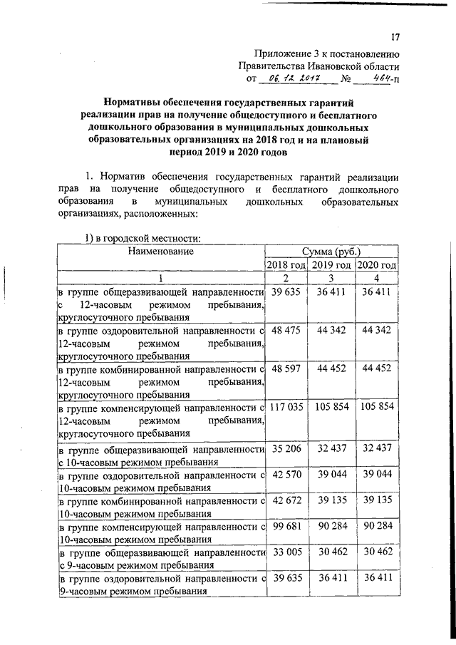 Постановление Правительства Ивановской области от 06.12.2017 N 464-п "Об утверждении нормативов обеспечения государственных гарантий реализации прав на получение общедоступного и бесплатного общего образования, обеспечения дополнительного образования в муниципальных образовательных организациях и возмещения затрат на финансовое обеспечение получения общего образования в частных образовательных организациях на 2018 год и на плановый период 2019 и 2020 годов" (вместе с "Нормативами обеспечения государственных гарантий реализации прав на получение общедоступного и бесплатного дошкольного, начального общего, основного общего, среднего общего образования в муниципальных общеобразовательных организациях, обеспечения дополнительного образования в муниципальных общеобразовательных организациях на 2018 год и на плановый период 2019 и 2020 годов", "Нормативами возмещения затрат на финансовое обеспечение получения дошкольного, начального общего, основного общего, среднего общего образования в частных общеобразовательных организациях, осуществляющих образовательную деятельность по имеющим государственную аккредитацию основным общеобразовательным программам, на 2018 год и на плановый период 2019 и 2020 годов", "Нормативами обеспечения государственных гарантий реализации прав на получение общедоступного и бесплатного дошкольного образования в муниципальных дошкольных образовательных организациях на 2018 год и на плановый период 2019 и 2020 годов", "Нормативами возмещения затрат на финансовое обеспечение получения дошкольного образования в частных дошкольных образовательных организациях на 2018 год и на плановый период 2019 и 2020 годов", "Перечнем малокомплектных муниципальных общеобразовательных организаций, для которых применяется норматив финансового обеспечения, учитывающий затраты, не зависящие от количества обучающихся, для расчета субвенций местным бюджетам в размере, необходимом для реализации основных общеобразовательных программ в части финансирования расходов на оплату труда работников общеобразовательных организаций, расходов на учебники, учебные пособия, средства обучения, игры, игрушки (за исключением расходов на содержание зданий и оплату коммунальных услуг, осуществляемых из местных бюджетов)")
