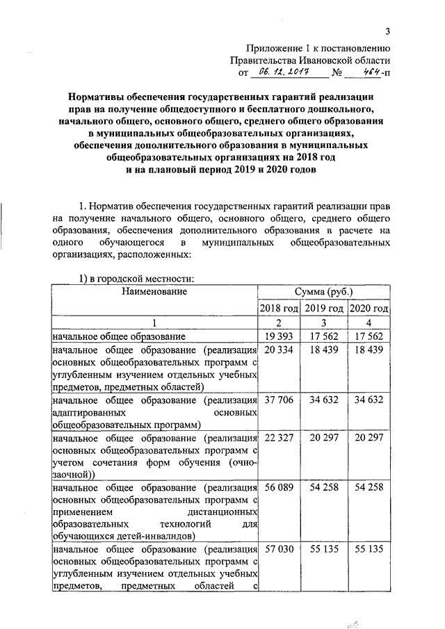 Постановление Правительства Ивановской области от 06.12.2017 N 464-п "Об утверждении нормативов обеспечения государственных гарантий реализации прав на получение общедоступного и бесплатного общего образования, обеспечения дополнительного образования в муниципальных образовательных организациях и возмещения затрат на финансовое обеспечение получения общего образования в частных образовательных организациях на 2018 год и на плановый период 2019 и 2020 годов" (вместе с "Нормативами обеспечения государственных гарантий реализации прав на получение общедоступного и бесплатного дошкольного, начального общего, основного общего, среднего общего образования в муниципальных общеобразовательных организациях, обеспечения дополнительного образования в муниципальных общеобразовательных организациях на 2018 год и на плановый период 2019 и 2020 годов", "Нормативами возмещения затрат на финансовое обеспечение получения дошкольного, начального общего, основного общего, среднего общего образования в частных общеобразовательных организациях, осуществляющих образовательную деятельность по имеющим государственную аккредитацию основным общеобразовательным программам, на 2018 год и на плановый период 2019 и 2020 годов", "Нормативами обеспечения государственных гарантий реализации прав на получение общедоступного и бесплатного дошкольного образования в муниципальных дошкольных образовательных организациях на 2018 год и на плановый период 2019 и 2020 годов", "Нормативами возмещения затрат на финансовое обеспечение получения дошкольного образования в частных дошкольных образовательных организациях на 2018 год и на плановый период 2019 и 2020 годов", "Перечнем малокомплектных муниципальных общеобразовательных организаций, для которых применяется норматив финансового обеспечения, учитывающий затраты, не зависящие от количества обучающихся, для расчета субвенций местным бюджетам в размере, необходимом для реализации основных общеобразовательных программ в части финансирования расходов на оплату труда работников общеобразовательных организаций, расходов на учебники, учебные пособия, средства обучения, игры, игрушки (за исключением расходов на содержание зданий и оплату коммунальных услуг, осуществляемых из местных бюджетов)")