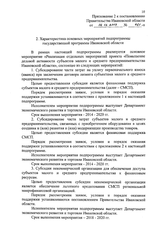 Постановление Правительства Ивановской области от 06.12.2017 N 461-п "О внесении изменений в постановление Правительства Ивановской области от 13.11.2013 N 459-п "Об утверждении государственной программы Ивановской области "Экономическое развитие и инновационная экономика Ивановской области" (вместе с "Порядком рассмотрения заявок, условиями и порядком оказания поддержки субъектам малого и среднего предпринимательства в виде субсидирования части затрат на уплату первоначального взноса (аванса) при заключении договора лизинга", "Порядком рассмотрения заявок, условиями и порядком оказания поддержки субъектам малого и среднего предпринимательства в виде субсидирования части затрат, связанных с приобретением оборудования в целях создания и (или) развития и (или) модернизации производства товаров", "Порядком рассмотрения заявок, условиями и порядком оказания поддержки в виде предоставления целевых грантов начинающим субъектам малого предпринимательства на создание собственного дела", "Порядком предоставления и распределения субсидий бюджетам муниципальных образований на реализацию мероприятий по строительству и (или) реконструкции объектов инфраструктуры, необходимых для реализации новых инвестиционных проектов в моногородах")