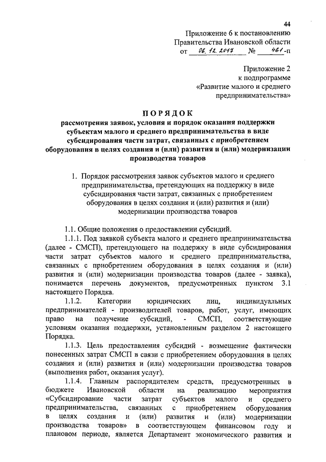Постановление Правительства Ивановской области от 06.12.2017 N 461-п "О внесении изменений в постановление Правительства Ивановской области от 13.11.2013 N 459-п "Об утверждении государственной программы Ивановской области "Экономическое развитие и инновационная экономика Ивановской области" (вместе с "Порядком рассмотрения заявок, условиями и порядком оказания поддержки субъектам малого и среднего предпринимательства в виде субсидирования части затрат на уплату первоначального взноса (аванса) при заключении договора лизинга", "Порядком рассмотрения заявок, условиями и порядком оказания поддержки субъектам малого и среднего предпринимательства в виде субсидирования части затрат, связанных с приобретением оборудования в целях создания и (или) развития и (или) модернизации производства товаров", "Порядком рассмотрения заявок, условиями и порядком оказания поддержки в виде предоставления целевых грантов начинающим субъектам малого предпринимательства на создание собственного дела", "Порядком предоставления и распределения субсидий бюджетам муниципальных образований на реализацию мероприятий по строительству и (или) реконструкции объектов инфраструктуры, необходимых для реализации новых инвестиционных проектов в моногородах")