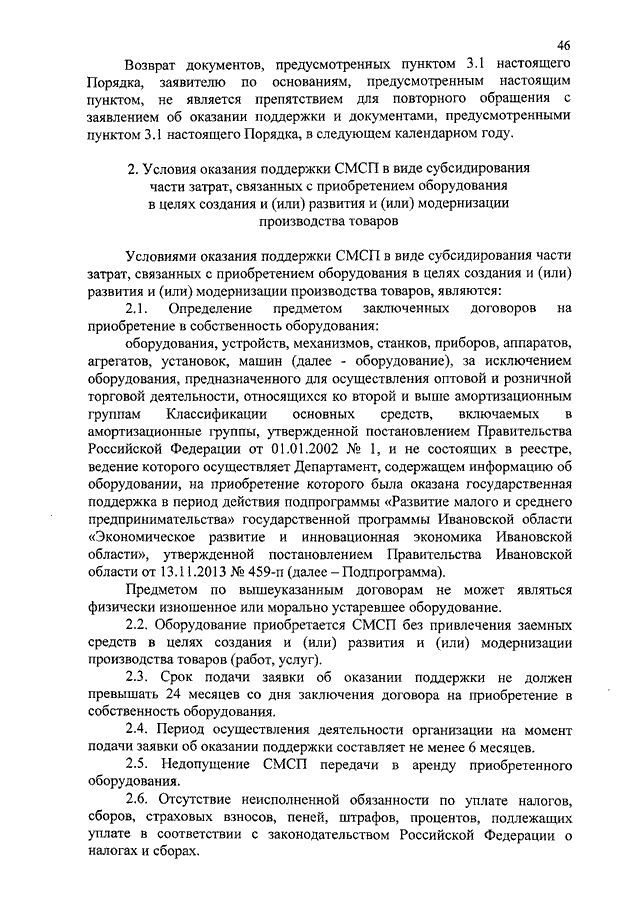 Постановление Правительства Ивановской области от 06.12.2017 N 461-п "О внесении изменений в постановление Правительства Ивановской области от 13.11.2013 N 459-п "Об утверждении государственной программы Ивановской области "Экономическое развитие и инновационная экономика Ивановской области" (вместе с "Порядком рассмотрения заявок, условиями и порядком оказания поддержки субъектам малого и среднего предпринимательства в виде субсидирования части затрат на уплату первоначального взноса (аванса) при заключении договора лизинга", "Порядком рассмотрения заявок, условиями и порядком оказания поддержки субъектам малого и среднего предпринимательства в виде субсидирования части затрат, связанных с приобретением оборудования в целях создания и (или) развития и (или) модернизации производства товаров", "Порядком рассмотрения заявок, условиями и порядком оказания поддержки в виде предоставления целевых грантов начинающим субъектам малого предпринимательства на создание собственного дела", "Порядком предоставления и распределения субсидий бюджетам муниципальных образований на реализацию мероприятий по строительству и (или) реконструкции объектов инфраструктуры, необходимых для реализации новых инвестиционных проектов в моногородах")