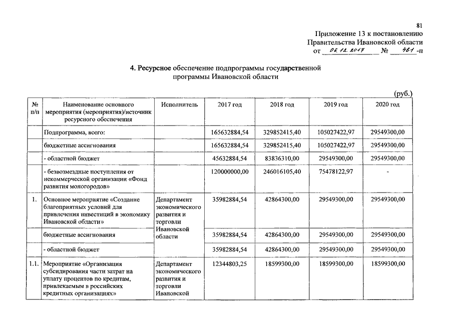 Постановление Правительства Ивановской области от 06.12.2017 N 461-п "О внесении изменений в постановление Правительства Ивановской области от 13.11.2013 N 459-п "Об утверждении государственной программы Ивановской области "Экономическое развитие и инновационная экономика Ивановской области" (вместе с "Порядком рассмотрения заявок, условиями и порядком оказания поддержки субъектам малого и среднего предпринимательства в виде субсидирования части затрат на уплату первоначального взноса (аванса) при заключении договора лизинга", "Порядком рассмотрения заявок, условиями и порядком оказания поддержки субъектам малого и среднего предпринимательства в виде субсидирования части затрат, связанных с приобретением оборудования в целях создания и (или) развития и (или) модернизации производства товаров", "Порядком рассмотрения заявок, условиями и порядком оказания поддержки в виде предоставления целевых грантов начинающим субъектам малого предпринимательства на создание собственного дела", "Порядком предоставления и распределения субсидий бюджетам муниципальных образований на реализацию мероприятий по строительству и (или) реконструкции объектов инфраструктуры, необходимых для реализации новых инвестиционных проектов в моногородах")