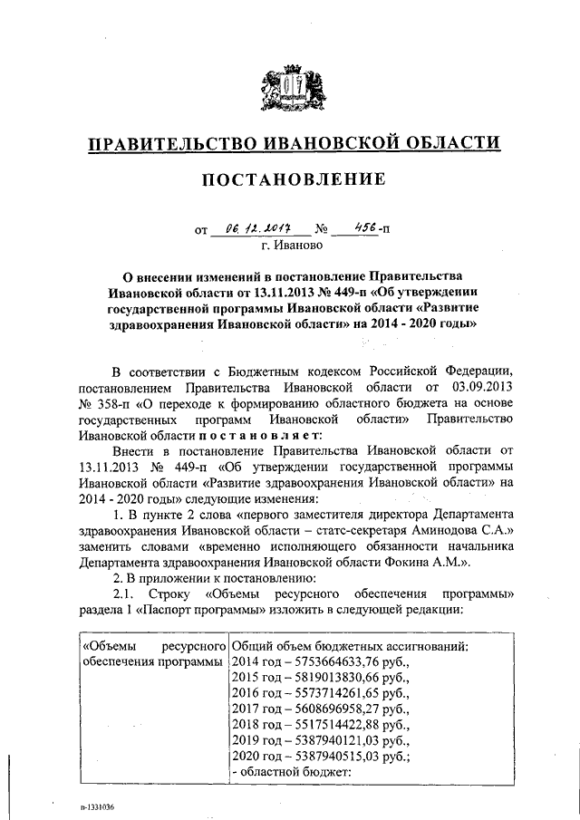 Постановление Правительства Ивановской области от 06.12.2017 N 456-п "О внесении изменений в постановление Правительства Ивановской области от 13.11.2013 N 449-п "Об утверждении государственной программы Ивановской области "Развитие здравоохранения Ивановской области" на 2014 - 2020 годы" (вместе с "Подпрограммой "Организация обязательного медицинского страхования на территории Ивановской области")