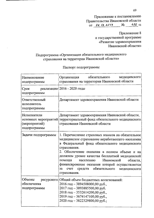 Постановление Правительства Ивановской области от 06.12.2017 N 456-п "О внесении изменений в постановление Правительства Ивановской области от 13.11.2013 N 449-п "Об утверждении государственной программы Ивановской области "Развитие здравоохранения Ивановской области" на 2014 - 2020 годы" (вместе с "Подпрограммой "Организация обязательного медицинского страхования на территории Ивановской области")