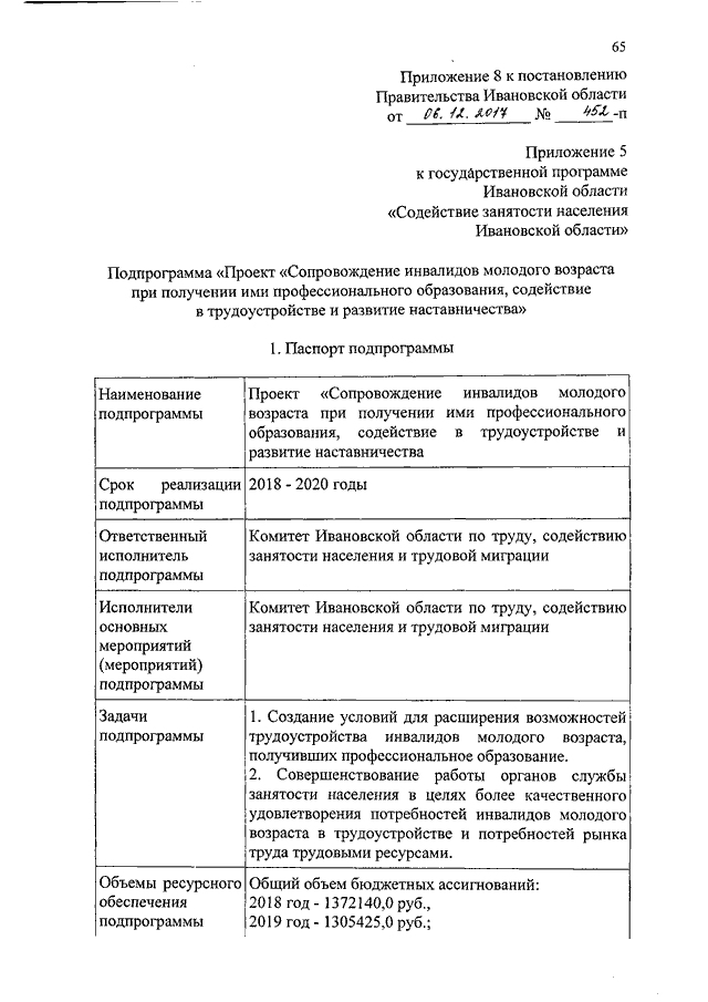 Постановление Правительства Ивановской области от 06.12.2017 N 452-п "О внесении изменений в постановление Правительства Ивановской области от 09.07.2013 N 279-п "Об утверждении государственной программы Ивановской области "Содействие занятости населения Ивановской области" (вместе с "Подпрограммой "Улучшение условий и охраны труда в Ивановской области", "Подпрограммой "Проект "Сопровождение инвалидов молодого возраста при получении ими профессионального образования, содействие в трудоустройстве и развитие наставничества")