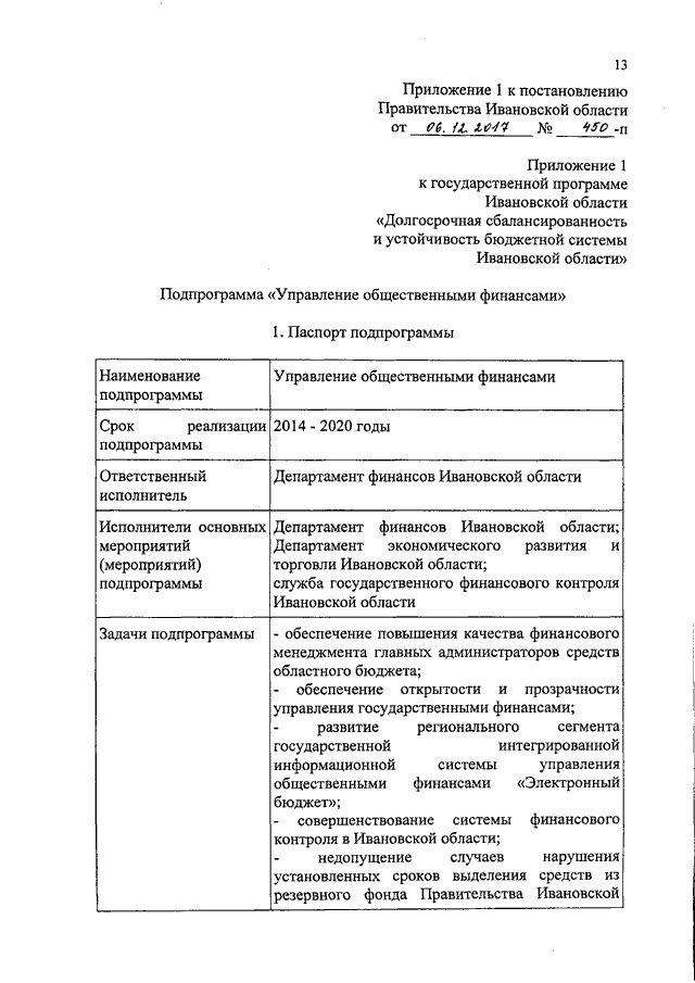 Постановление Правительства Ивановской области от 06.12.2017 N 450-п "О внесении изменений в постановление Правительства Ивановской области от 30.10.2013 N 429-п "Об утверждении государственной программы Ивановской области "Долгосрочная сбалансированность и устойчивость бюджетной системы Ивановской области" (вместе с "Подпрограммой "Управление общественными финансами", "Подпрограммой "Управление государственным долгом Ивановской области")