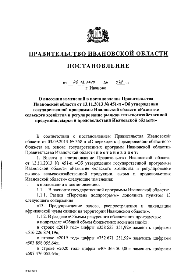 Постановление Правительства Ивановской области от 06.12.2017 N 448-п "О внесении изменений в постановление Правительства Ивановской области от 13.11.2013 N 451-п "Об утверждении государственной программы Ивановской области "Развитие сельского хозяйства и регулирование рынков сельскохозяйственной продукции, сырья и продовольствия Ивановской области" (вместе с "Подпрограммой "Предупреждение заноса, распространения и ликвидации африканской чумы свиней на территории Ивановской области")