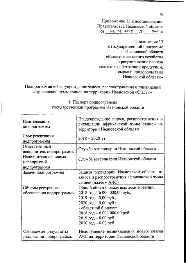 Постановление Правительства Ивановской области от 06.12.2017 N 448-п "О внесении изменений в постановление Правительства Ивановской области от 13.11.2013 N 451-п "Об утверждении государственной программы Ивановской области "Развитие сельского хозяйства и регулирование рынков сельскохозяйственной продукции, сырья и продовольствия Ивановской области" (вместе с "Подпрограммой "Предупреждение заноса, распространения и ликвидации африканской чумы свиней на территории Ивановской области")
