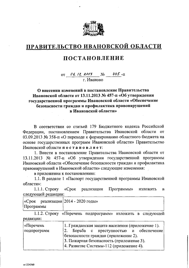 Постановление Правительства Ивановской области от 06.12.2017 N 445-п "О внесении изменений в постановление Правительства Ивановской области от 13.11.2013 N 457-п "Об утверждении государственной программы Ивановской области "Обеспечение безопасности граждан и профилактика правонарушений в Ивановской области" (вместе с "Подпрограммой "Повышение безопасности дорожного движения в Ивановской области", "Подпрограммой "Гражданская защита населения и пожарная безопасность Ивановской области")