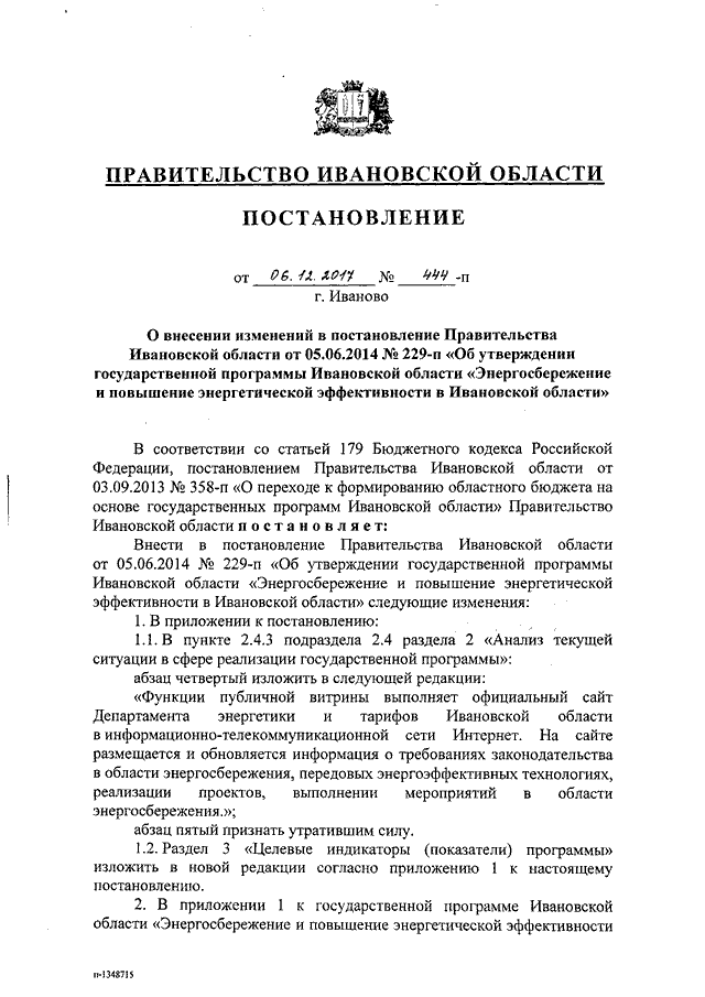 Постановление Правительства Ивановской области от 06.12.2017 N 444-п "О внесении изменений в постановление Правительства Ивановской области от 05.06.2014 N 229-п "Об утверждении государственной программы Ивановской области "Энергосбережение и повышение энергетической эффективности в Ивановской области" (вместе с "Подпрограммой "Информационно-методическое сопровождение реализации государственной программы")