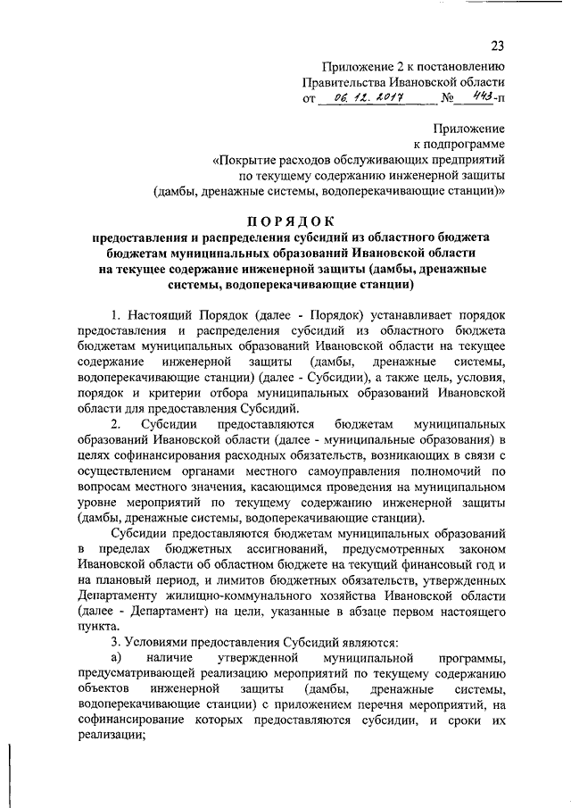 Постановление Правительства Ивановской области от 06.12.2017 N 443-п "О внесении изменений в постановление Правительства Ивановской области от 30.10.2013 N 430-п "Об утверждении государственной программы Ивановской области "Развитие водохозяйственного комплекса Ивановской области" (вместе с "Порядком предоставления и распределения субсидий бюджетам муниципальных образований Ивановской области на восстановление и экологическую реабилитацию водных объектов, утративших способность к самоочищению, предотвращение истощения водных объектов, ликвидацию их засорения и загрязнения", "Порядком предоставления и распределения субсидий из областного бюджета бюджетам муниципальных образований Ивановской области на текущее содержание инженерной защиты (дамбы, дренажные системы, водоперекачивающие станции)", "Порядком предоставления и распределения субсидий бюджетам муниципальных образований Ивановской области на повышение эксплуатационной надежности гидротехнических сооружений", "Порядком предоставления и распределения субсидий бюджетам муниципальных образований Ивановской области на обеспечение населения и объектов экономики сооружениями инженерной защиты")