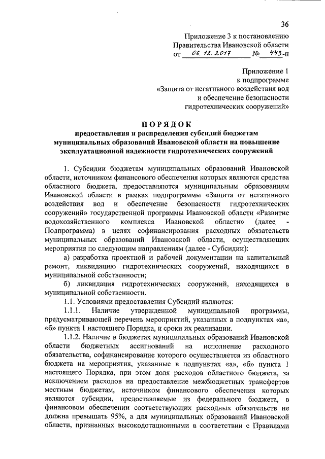 Постановление Правительства Ивановской области от 06.12.2017 N 443-п "О внесении изменений в постановление Правительства Ивановской области от 30.10.2013 N 430-п "Об утверждении государственной программы Ивановской области "Развитие водохозяйственного комплекса Ивановской области" (вместе с "Порядком предоставления и распределения субсидий бюджетам муниципальных образований Ивановской области на восстановление и экологическую реабилитацию водных объектов, утративших способность к самоочищению, предотвращение истощения водных объектов, ликвидацию их засорения и загрязнения", "Порядком предоставления и распределения субсидий из областного бюджета бюджетам муниципальных образований Ивановской области на текущее содержание инженерной защиты (дамбы, дренажные системы, водоперекачивающие станции)", "Порядком предоставления и распределения субсидий бюджетам муниципальных образований Ивановской области на повышение эксплуатационной надежности гидротехнических сооружений", "Порядком предоставления и распределения субсидий бюджетам муниципальных образований Ивановской области на обеспечение населения и объектов экономики сооружениями инженерной защиты")