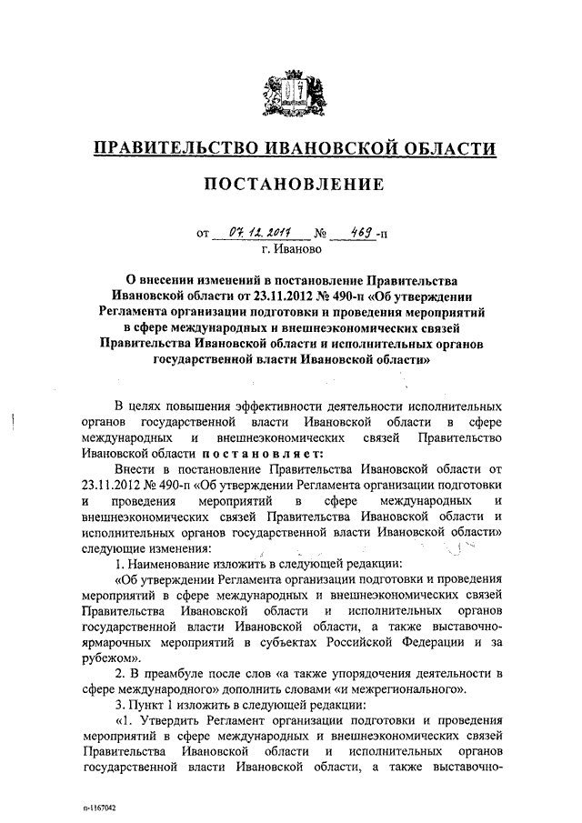 Постановление Правительства Ивановской области от 07.12.2017 N 469-п "О внесении изменений в постановление Правительства Ивановской области от 23.11.2012 N 490-п "Об утверждении Регламента организации подготовки и проведения мероприятий в сфере международных и внешнеэкономических связей Правительства Ивановской области и исполнительных органов государственной власти Ивановской области"