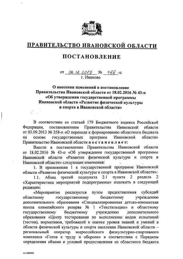 Постановление Правительства Ивановской области от 06.12.2017 N 466-п "О внесении изменений в постановление Правительства Ивановской области от 18.02.2016 N 43-п "Об утверждении государственной программы Ивановской области "Развитие физической культуры и спорта в Ивановской области" (вместе с "Порядком предоставления субсидии на оказание адресной финансовой поддержки областным государственным и муниципальным учреждениям дополнительного образования Ивановской области в сфере физической культуры и спорта, осуществляющим подготовку спортивного резерва для спортивных сборных команд Российской Федерации")