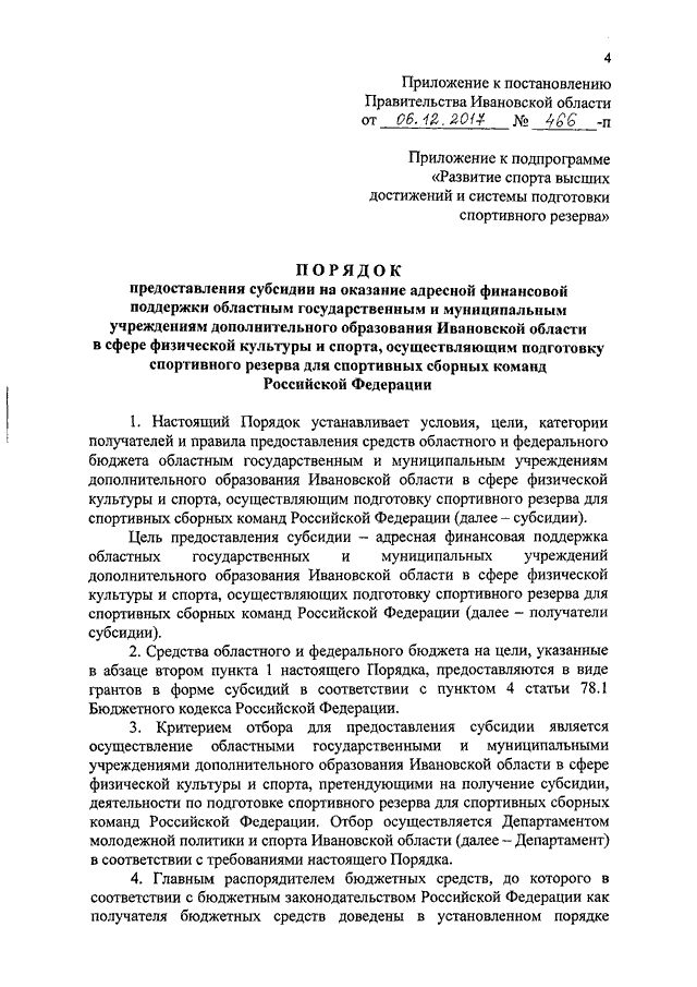 Постановление Правительства Ивановской области от 06.12.2017 N 466-п "О внесении изменений в постановление Правительства Ивановской области от 18.02.2016 N 43-п "Об утверждении государственной программы Ивановской области "Развитие физической культуры и спорта в Ивановской области" (вместе с "Порядком предоставления субсидии на оказание адресной финансовой поддержки областным государственным и муниципальным учреждениям дополнительного образования Ивановской области в сфере физической культуры и спорта, осуществляющим подготовку спортивного резерва для спортивных сборных команд Российской Федерации")