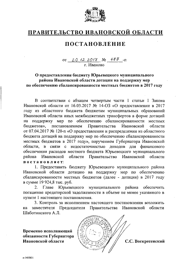Постановление Правительства Ивановской области от 20.12.2017 N 477-п "О предоставлении бюджету Юрьевецкого муниципального района Ивановской области дотации на поддержку мер по обеспечению сбалансированности местных бюджетов в 2017 году"