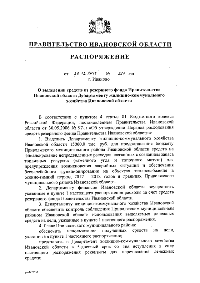 Распоряжение Правительства Ивановской области от 20.12.2017 N 221-рп "О выделении средств из резервного фонда Правительства Ивановской области Департаменту жилищно-коммунального хозяйства Ивановской области"