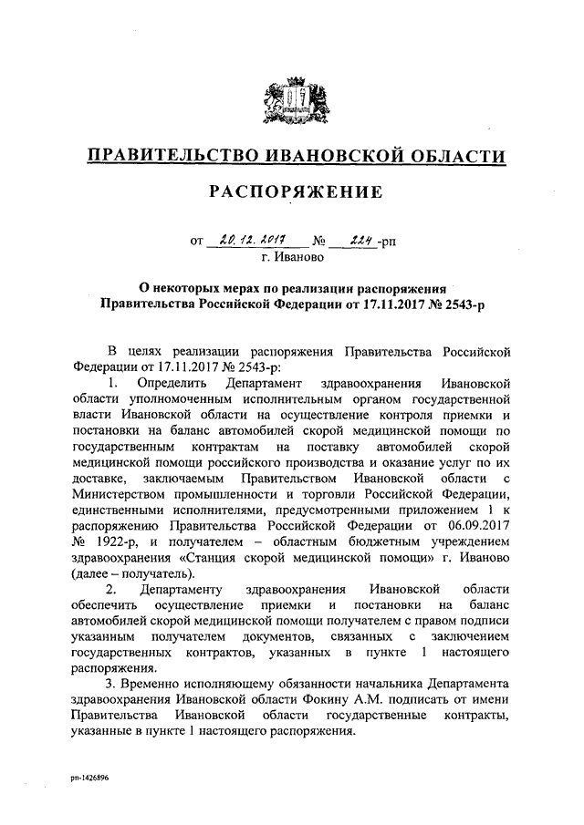 Распоряжение Правительства Ивановской области от 20.12.2017 N 224-рп "О некоторых мерах по реализации распоряжения Правительства Российской Федерации от 17.11.2017 N 2543-р"
