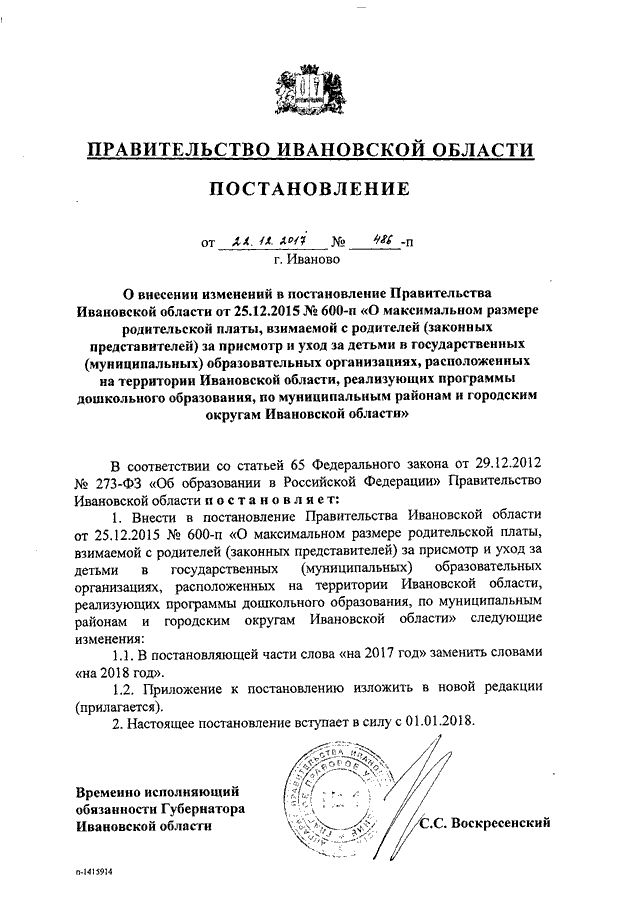 Постановление Правительства Ивановской области от 22.12.2017 N 486-п "О внесении изменений в постановление Правительства Ивановской области от 25.12.2015 N 600-п "О максимальном размере родительской платы, взимаемой с родителей (законных представителей) за присмотр и уход за детьми в государственных (муниципальных) образовательных организациях, расположенных на территории Ивановской области, реализующих программы дошкольного образования, по муниципальным районам и городским округам Ивановской области"