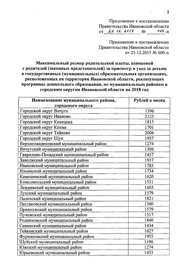 Постановление Правительства Ивановской области от 22.12.2017 N 486-п "О внесении изменений в постановление Правительства Ивановской области от 25.12.2015 N 600-п "О максимальном размере родительской платы, взимаемой с родителей (законных представителей) за присмотр и уход за детьми в государственных (муниципальных) образовательных организациях, расположенных на территории Ивановской области, реализующих программы дошкольного образования, по муниципальным районам и городским округам Ивановской области"
