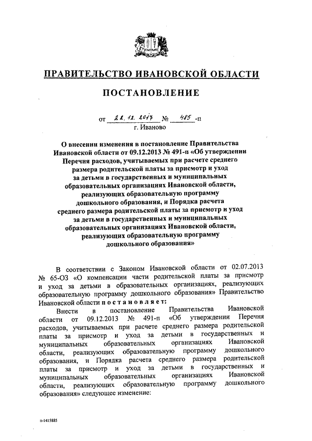 Постановление Правительства Ивановской области от 22.12.2017 N 485-п "О внесении изменения в постановление Правительства Ивановской области от 09.12.2013 N 491-п "Об утверждении Перечня расходов, учитываемых при расчете среднего размера родительской платы за присмотр и уход за детьми в государственных и муниципальных образовательных организациях Ивановской области, реализующих образовательную программу дошкольного образования, и Порядка расчета среднего размера родительской платы за присмотр и уход за детьми в государственных и муниципальных образовательных организациях Ивановской области, реализующих образовательную программу дошкольного образования"