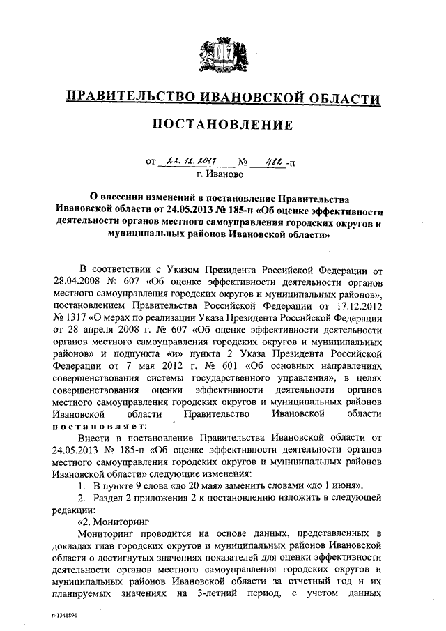 Постановление Правительства Ивановской области от 22.12.2017 N 482-п "О внесении изменений в постановление Правительства Ивановской области от 24.05.2013 N 185-п "Об оценке эффективности деятельности органов местного самоуправления городских округов и муниципальных районов Ивановской области"