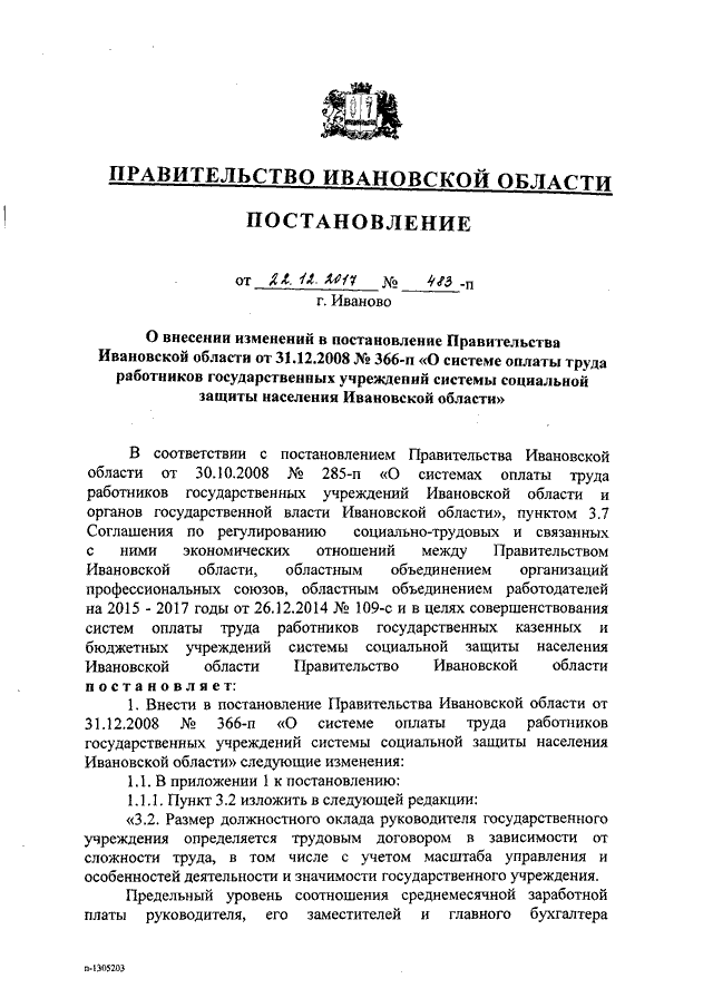 Постановление Правительства Ивановской области от 22.12.2017 N 483-п "О внесении изменений в постановление Правительства Ивановской области от 31.12.2008 N 366-п "О системе оплаты труда работников государственных учреждений системы социальной защиты населения Ивановской области"