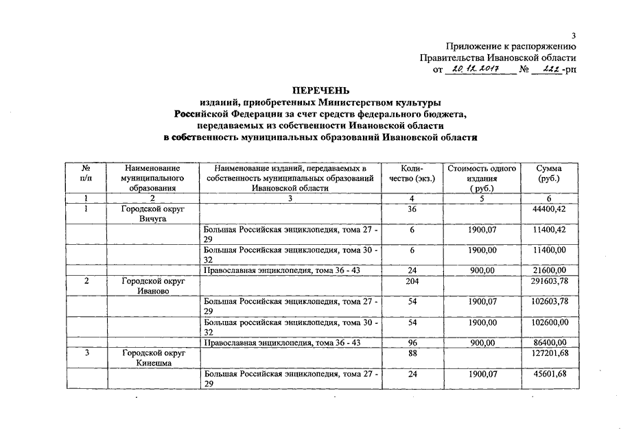 Распоряжение Правительства Ивановской области от 20.12.2017 N 222-рп "О передаче в собственность муниципальных образований Ивановской области изданий, приобретенных Министерством культуры Российской Федерации за счет средств федерального бюджета"