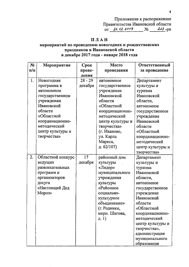 Распоряжение Правительства Ивановской области от 20.12.2017 N 223-рп "Об организации и проведении новогодних и рождественских праздников в Ивановской области"