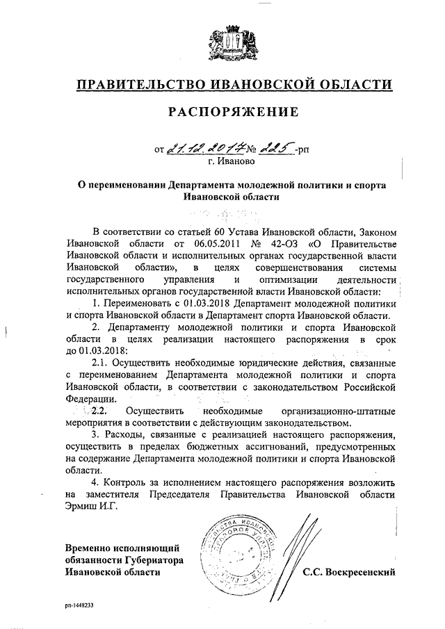 Распоряжение Правительства Ивановской области от 21.12.2017 N 225-рп "О переименовании Департамента молодежной политики и спорта Ивановской области"