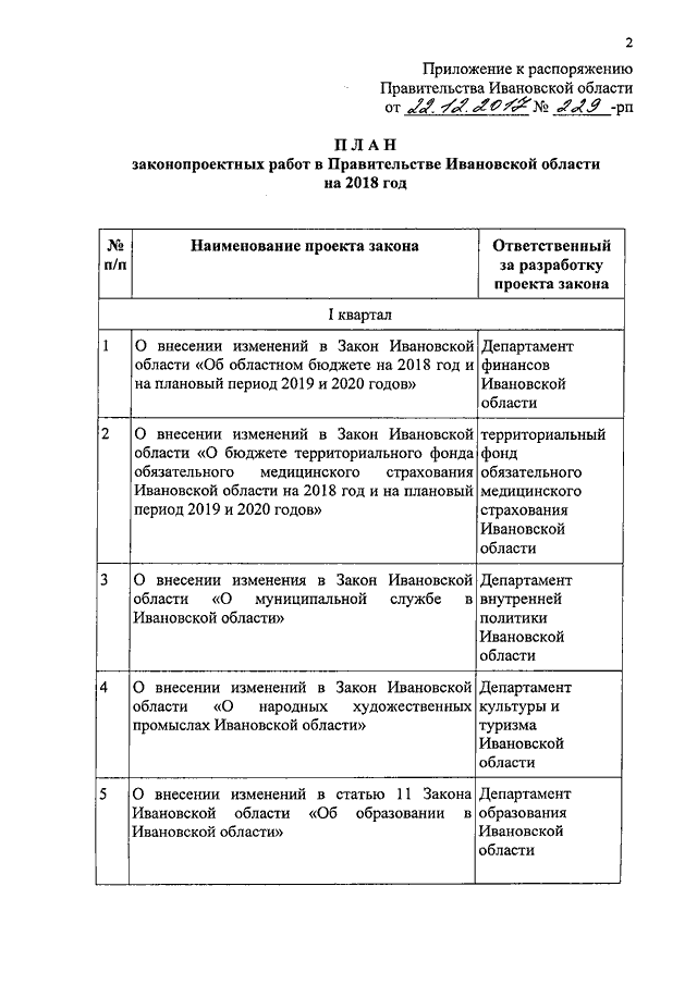 Распоряжение Правительства Ивановской области от 22.12.2017 N 229-рп "О плане законопроектных работ в Правительстве Ивановской области на 2018 год"