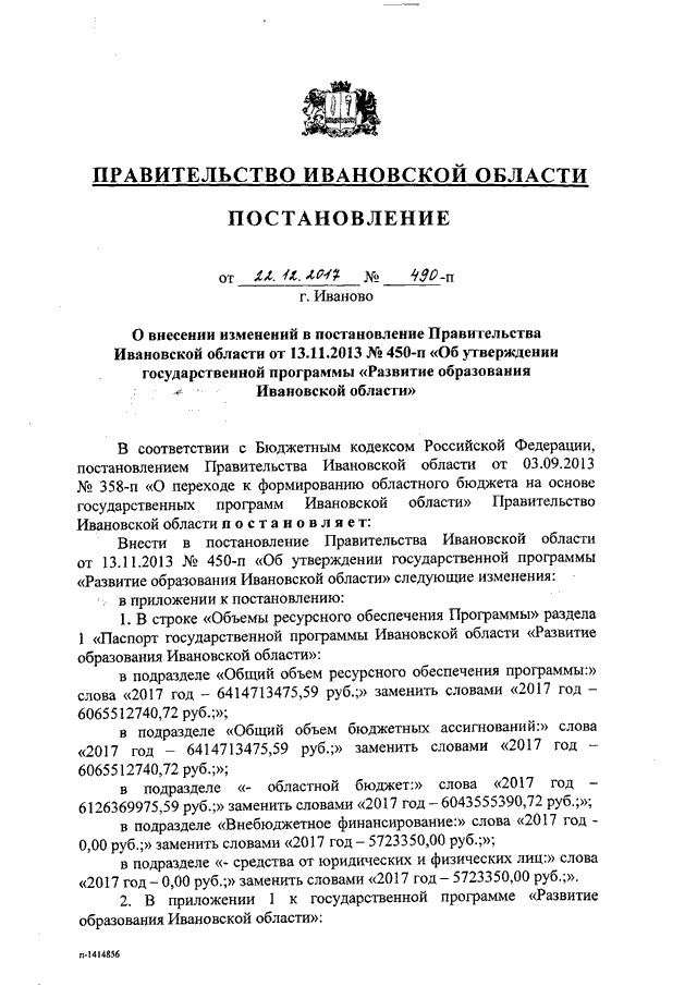 Постановление Правительства Ивановской области от 22.12.2017 N 490-п "О внесении изменений в постановление Правительства Ивановской области от 13.11.2013 N 450-п "Об утверждении государственной программы "Развитие образования Ивановской области" (вместе с "Порядком предоставления и распределения субсидий бюджетам муниципальных районов и городских округов Ивановской области на реализацию мероприятий по созданию условий, обеспечивающих доступность дополнительных общеобразовательных программ естественно-научной и технической направленности для обучающихся")