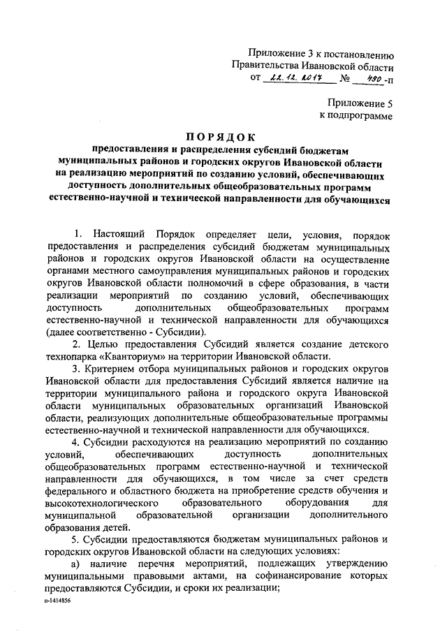 Постановление Правительства Ивановской области от 22.12.2017 N 490-п "О внесении изменений в постановление Правительства Ивановской области от 13.11.2013 N 450-п "Об утверждении государственной программы "Развитие образования Ивановской области" (вместе с "Порядком предоставления и распределения субсидий бюджетам муниципальных районов и городских округов Ивановской области на реализацию мероприятий по созданию условий, обеспечивающих доступность дополнительных общеобразовательных программ естественно-научной и технической направленности для обучающихся")