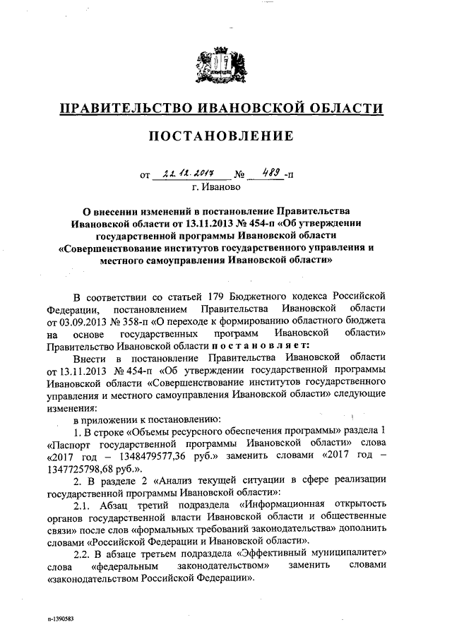 Постановление Правительства Ивановской области от 22.12.2017 N 489-п "О внесении изменений в постановление Правительства Ивановской области от 13.11.2013 N 454-п "Об утверждении государственной программы Ивановской области "Совершенствование институтов государственного управления и местного самоуправления Ивановской области"