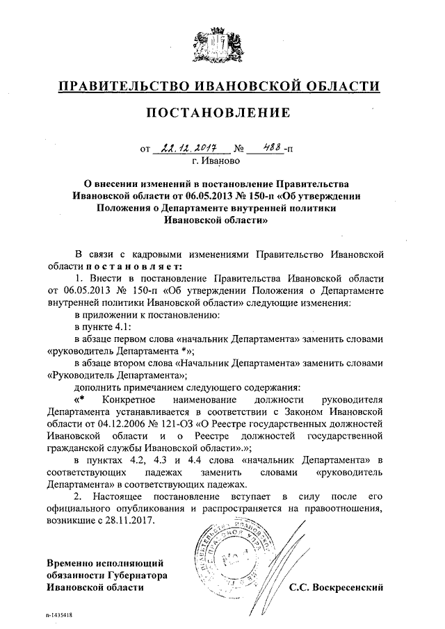 Постановление Правительства Ивановской области от 22.12.2017 N 488-п "О внесении изменений в постановление Правительства Ивановской области от 06.05.2013 N 150-п "Об утверждении Положения о Департаменте внутренней политики Ивановской области"
