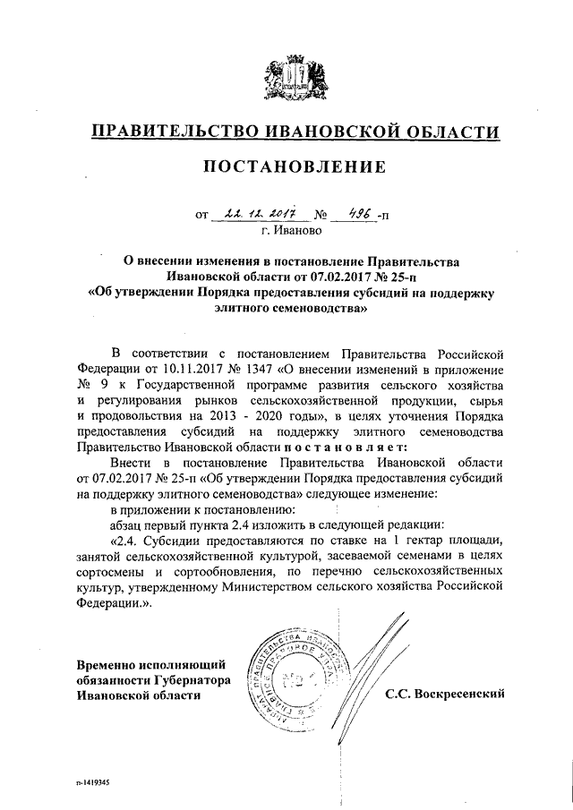 Постановление Правительства Ивановской области от 22.12.2017 N 496-п "О внесении изменения в постановление Правительства Ивановской области от 07.02.2017 N 25-п "Об утверждении Порядка предоставления субсидий на поддержку элитного семеноводства"