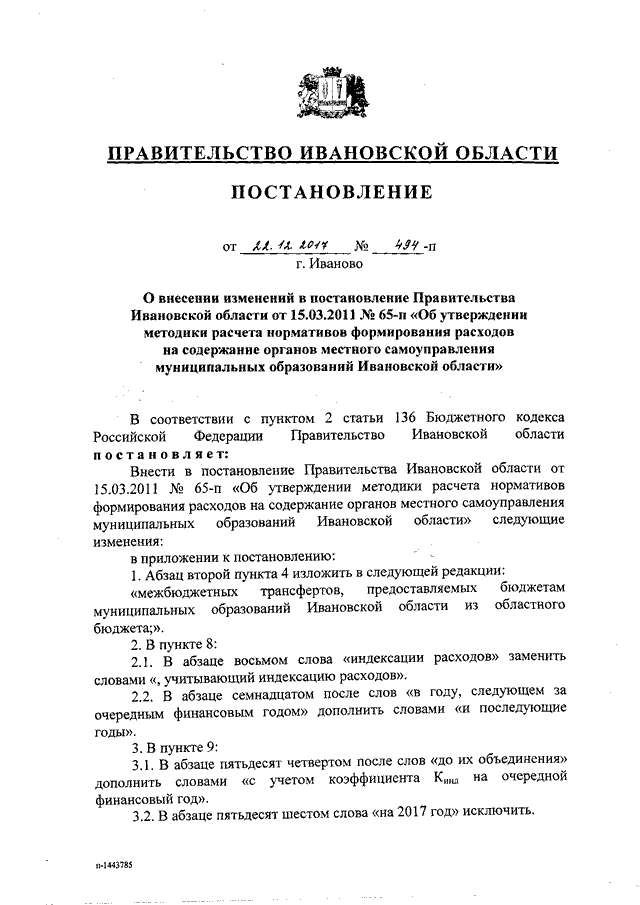 Постановление Правительства Ивановской области от 22.12.2017 N 494-п "О внесении изменений в постановление Правительства Ивановской области от 15.03.2011 N 65-п "Об утверждении методики расчета нормативов формирования расходов на содержание органов местного самоуправления муниципальных образований Ивановской области"