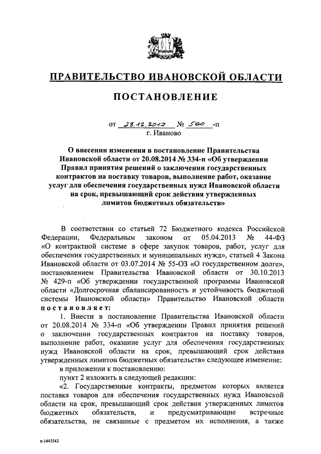 Постановление Правительства Ивановской области от 28.12.2017 N 500-п "О внесении изменения в постановление Правительства Ивановской области от 20.08.2014 N 334-п "Об утверждении Правил принятия решений о заключении государственных контрактов на поставку товаров, выполнение работ, оказание услуг для обеспечения государственных нужд Ивановской области на срок, превышающий срок действия утвержденных лимитов бюджетных обязательств"