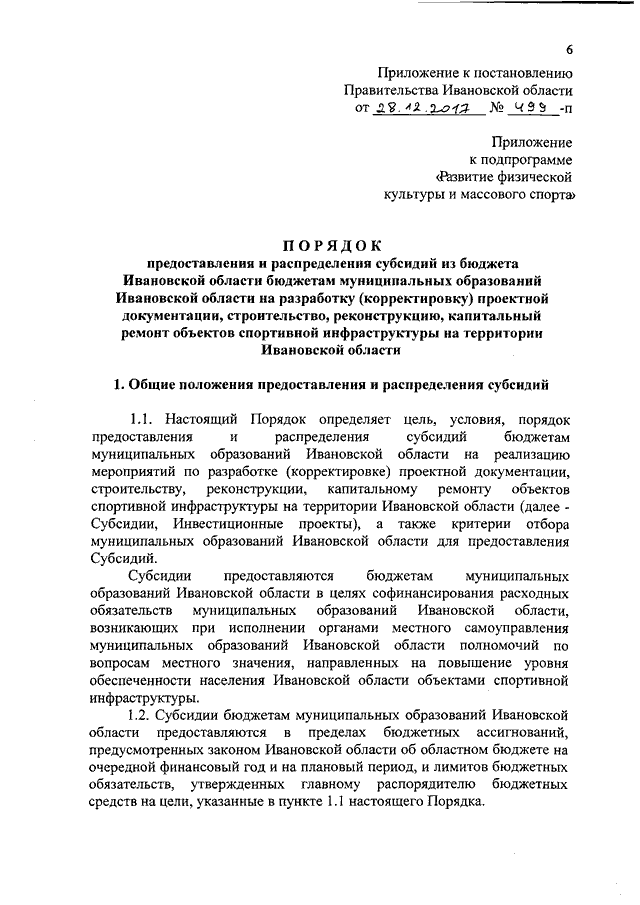 Постановление Правительства Ивановской области от 28.12.2017 N 499-п "О внесении изменений в постановление Правительства Ивановской области от 18.02.2016 N 43-п "Об утверждении государственной программы Ивановской области "Развитие физической культуры и спорта в Ивановской области" (вместе с "Порядком предоставления и распределения субсидий из бюджета Ивановской области бюджетам муниципальных образований Ивановской области на разработку (корректировку) проектной документации, строительство, реконструкцию, капитальный ремонт объектов спортивной инфраструктуры на территории Ивановской области")