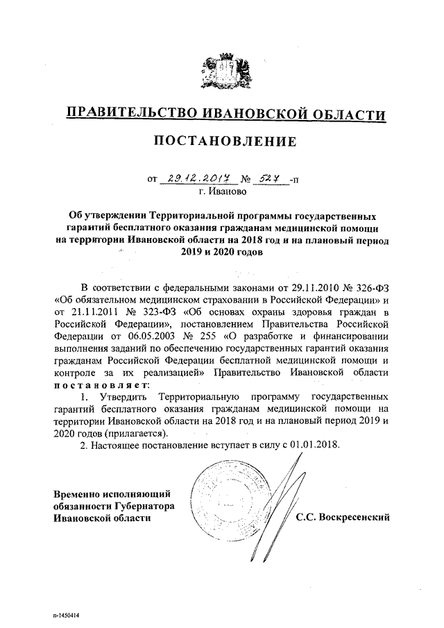 Постановление Правительства Ивановской области от 29.12.2017 N 527-п "Об утверждении Территориальной программы государственных гарантий бесплатного оказания гражданам медицинской помощи на территории Ивановской области на 2018 год и на плановый период 2019 и 2020 годов"