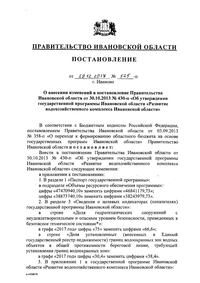 Постановление Правительства Ивановской области от 29.12.2017 N 525-п "О внесении изменений в постановление Правительства Ивановской области от 30.10.2013 N 430-п "Об утверждении государственной программы Ивановской области "Развитие водохозяйственного комплекса Ивановской области"