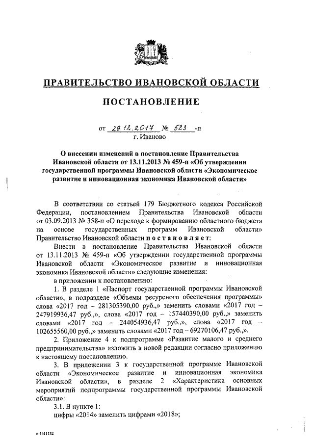 Постановление Правительства Ивановской области от 29.12.2017 N 523-п "О внесении изменений в постановление Правительства Ивановской области от 13.11.2013 N 459-п "Об утверждении государственной программы Ивановской области "Экономическое развитие и инновационная экономика Ивановской области" (вместе с "Порядком предоставления и распределения субсидий из областного бюджета бюджетам муниципальных образований Ивановской области на создание промышленного (индустриального) парка")